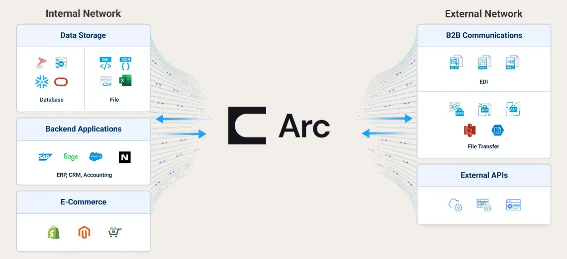 Arc can parse any file type (CSV, Excel, XML, etc.) and move or replicate files — whether in your on-premises file system or cloud storage (Azure Blob, AWS S3, SharePoint, etc.). Arc can be an S/FTP or AS2 server in a box, supporting protocols like AS4 and OFTP.